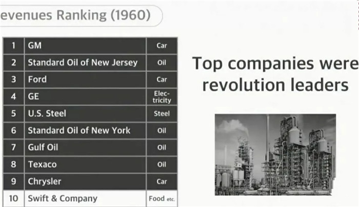 換句話說,1960年全世界最大的公司基本上是兩類:汽車和能源。在那個(gè)年代,投資這兩類公司,你就投資了未來。