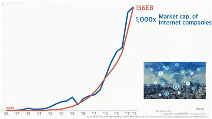 這是全球網(wǎng)絡(luò)的流量,橫坐標(biāo)是年份。紅色的線代表流量。從最早的1995年到2018年,網(wǎng)絡(luò)的流量,增加了100萬倍。我們?cè)賮砜戳硪粭l藍(lán)色的線。藍(lán)色的線,表現(xiàn)的是23年來全球互聯(lián)網(wǎng)公司的市場價(jià)值(市值)。