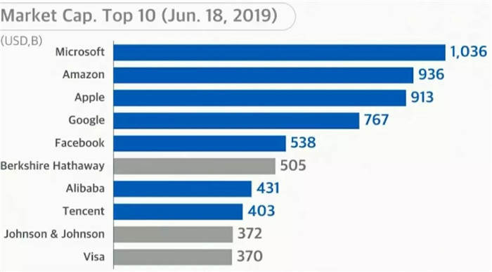 而今天,2019年市值十大的公司:微軟、亞馬遜、蘋果、谷歌、臉書、阿里巴巴、騰訊,全都是網(wǎng)絡(luò)公司。全世界市值十大的公司里,有七家是網(wǎng)絡(luò)公司。