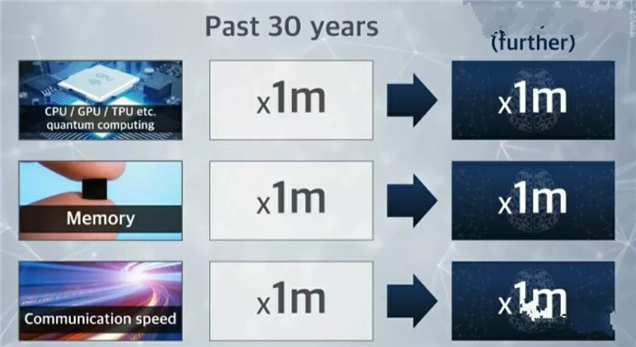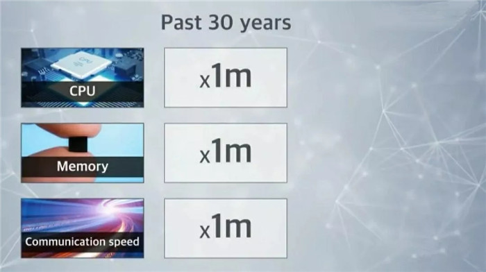 各位,處理器的運(yùn)算能力,記憶體的儲(chǔ)存能力,互聯(lián)網(wǎng)的傳輸能力,在這30年來,都成長了100萬倍。30年來,成長的幅度是這樣,那再過30年呢?