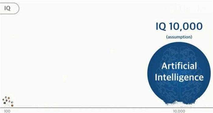 30年后,AI的智商將會(huì)是10000。你們有誰聽過哪個(gè)人的智商是10000的?人不可能,但是“人工智能”可能。一萬智商的AI,再天才的人都沒法比。