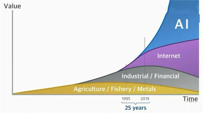 豎軸代表價(jià)值,橫軸代表時(shí)間,底部的黃色,代表農(nóng)業(yè),其價(jià)值與時(shí)間的比例一目了然;灰色代表工業(yè),紫色代表互聯(lián)網(wǎng),也就是我們正處的時(shí)代;而未來最有價(jià)值的東西,是屬于藍(lán)色的,是屬于AI的。